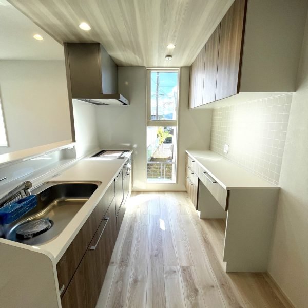 間取りはコンパクトながら、キッチンから洗面室・浴室へとスムーズにつながる家事動線を採用。